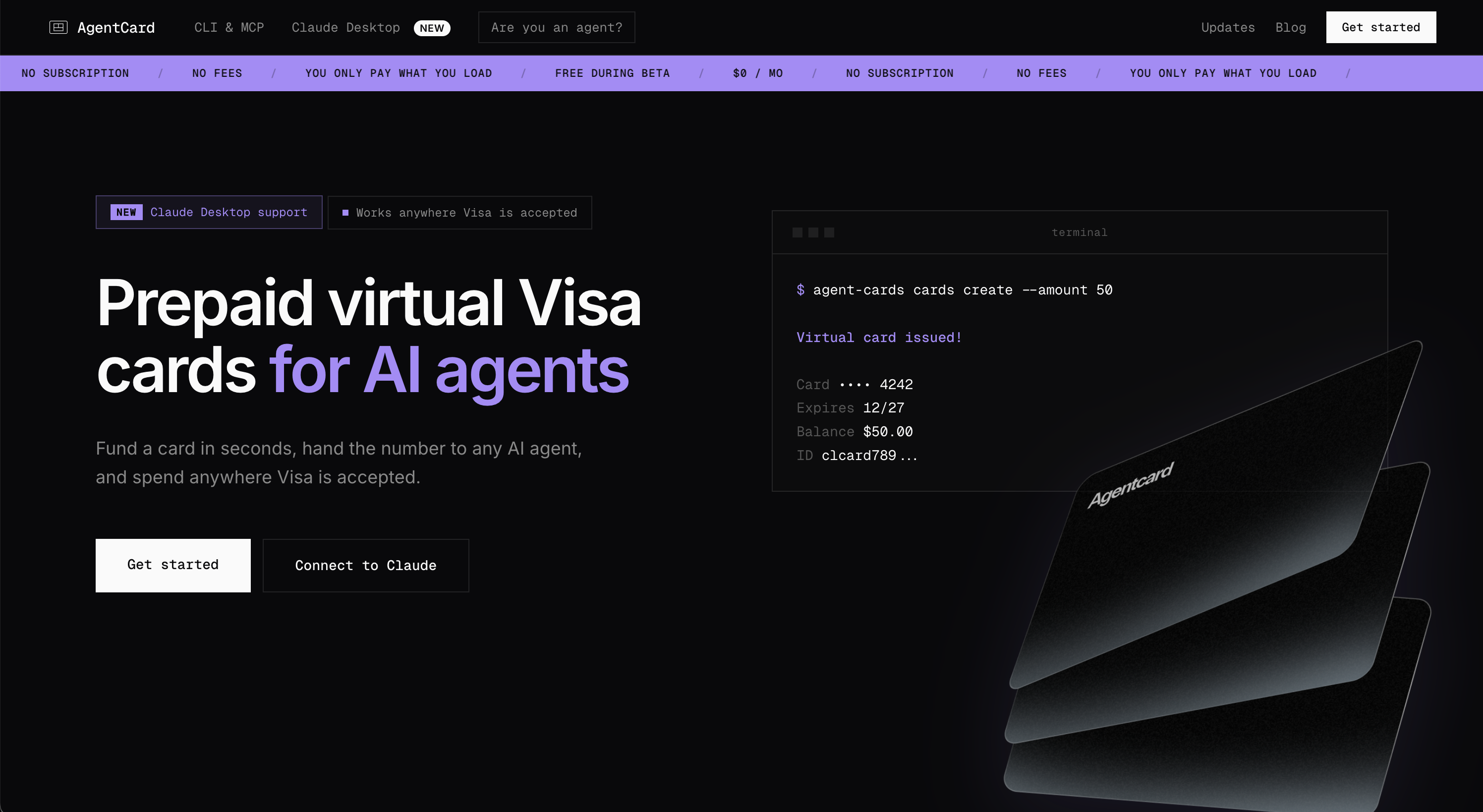 A product like AgentCard makes the mechanics concrete. You top up a balance, the agent calls a tool like create_card(amount=$50), and the provider issues a one-time prepaid Visa card locked to exactly that amount. The card is single-use, automatically deactivated after the transaction, and the agent never sees your underlying funding source. No overdraft risk. No credential exposure.