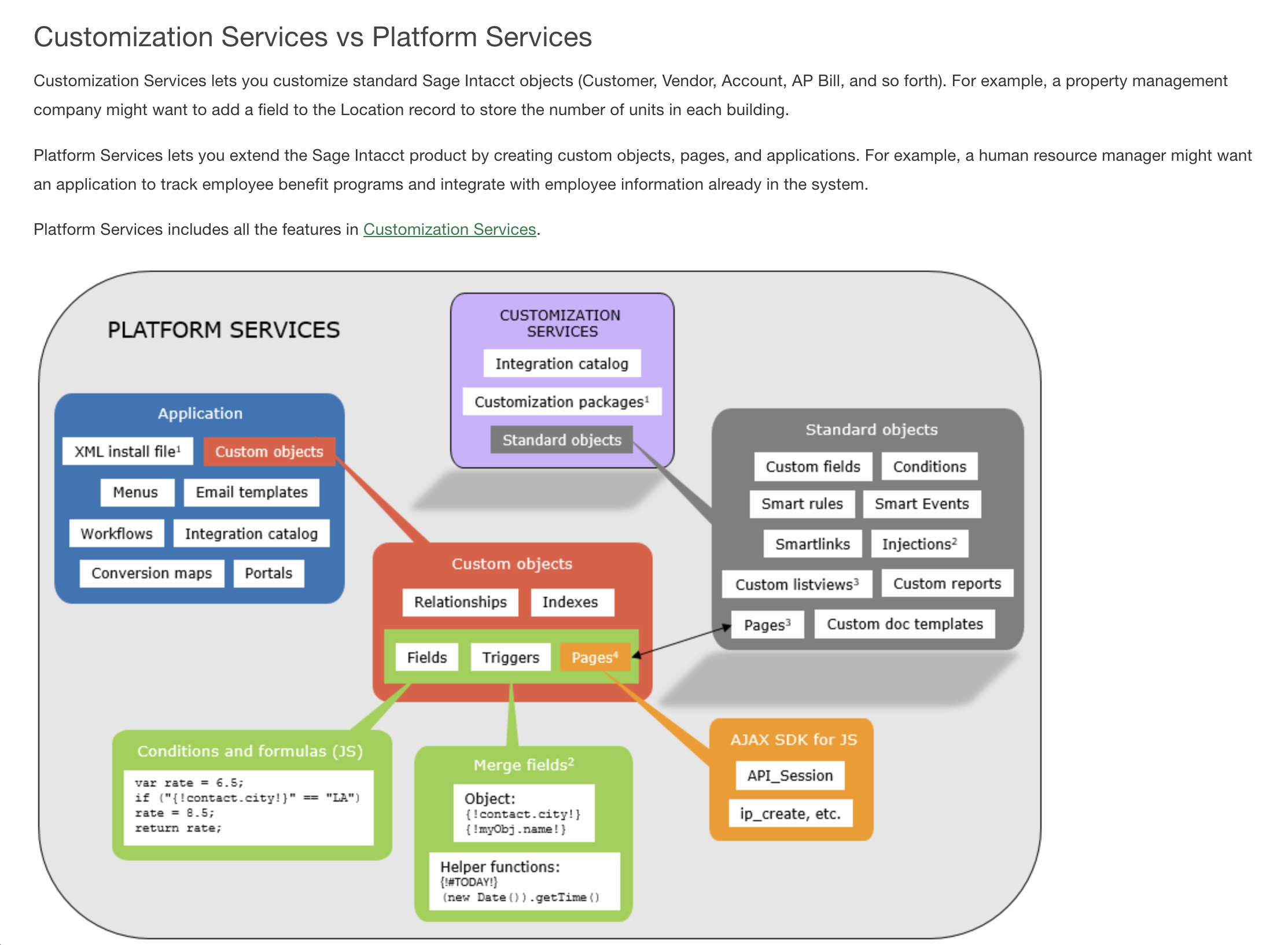 Platform Services lets developers create custom objects (with their own fields and relationships) and build full applications with menus and workflows. Behavior can be injected via JavaScript using the AJAX SDK. A Platform application groups custom objects and navigation menus into a self-contained mini-app inside Intacct. The entire application definition exports as XML, making it portable across Intacct companies.