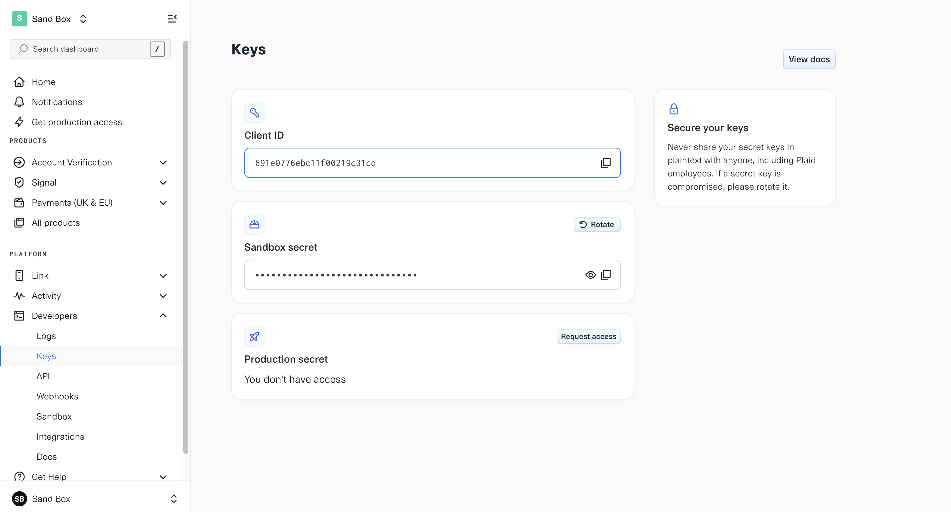 client_idandsecretin environment variables or a dedicated secrets manager (AWS Secrets Manager or similar). - Use separate secrets for Sandbox and Production. Plaid generates different secrets per environment by default, so don't mix them up.