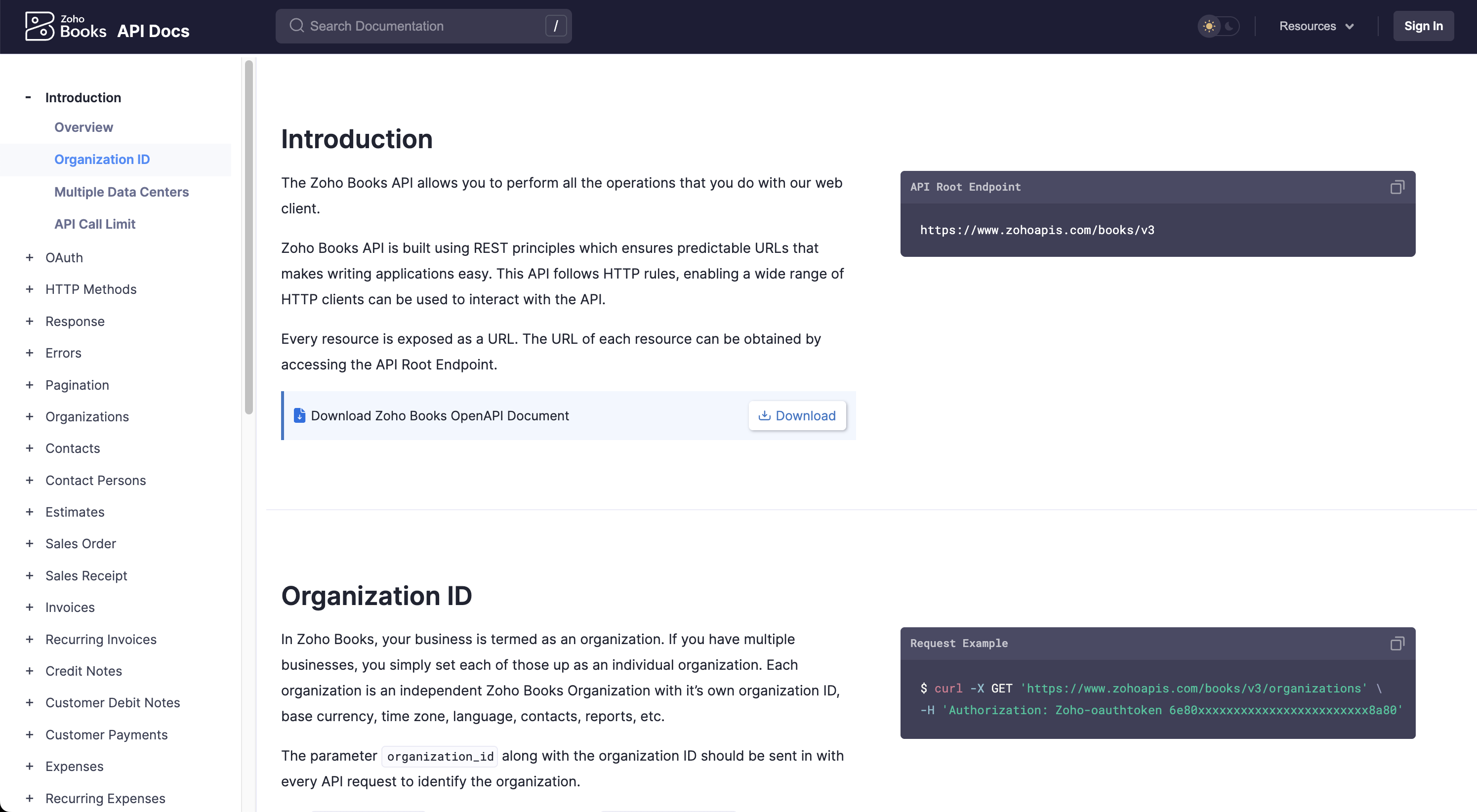 Every API request requires two things: an OAuth 2.0 access token and an organization_id parameter. Zoho Books supports multiple organizations under a single account, and the API enforces strict separation between them. You'll need to retrieve the organization ID first (via GET /organizations) before calling any other endpoint.